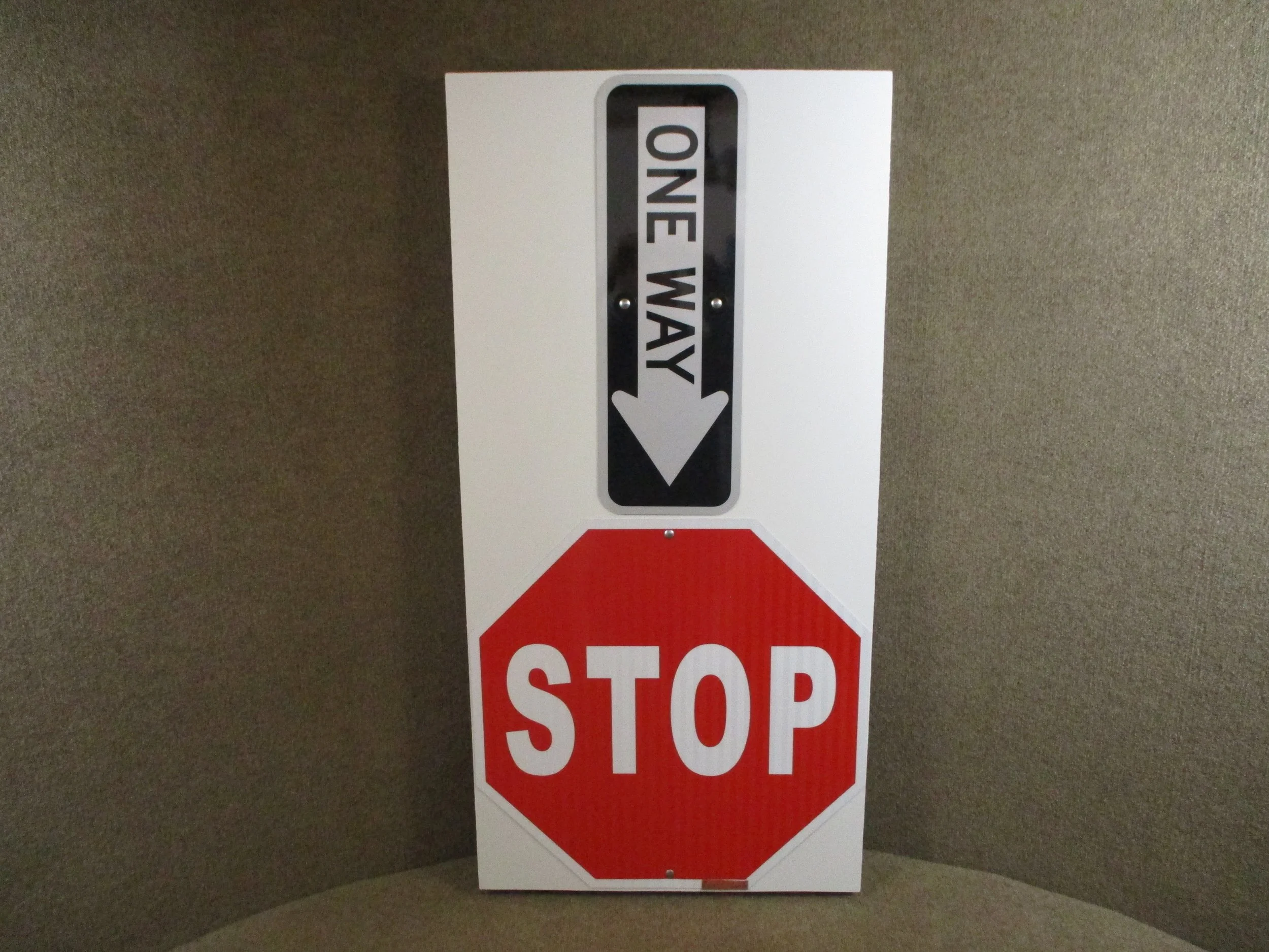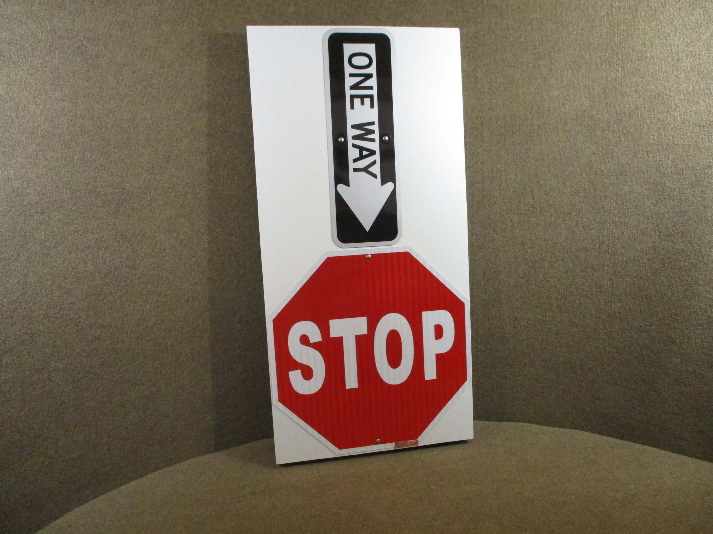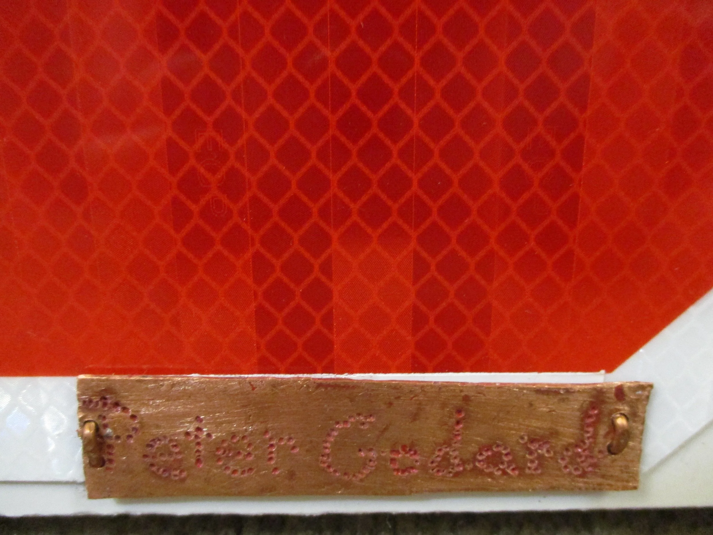 Our lead sculptor Peter Godard takes a new twist with his creation STOP! ONE WAY! The simple bold colors and geometric shapes belies the mysteries of the eturnal. The relief sculptres dimentions are 24x48x2.5 . Fashoned from aluminum road signs and fastened to a handmade wood and polystyrene frame. It is signed with Peter’s hallmark hand crafted copper name plate.