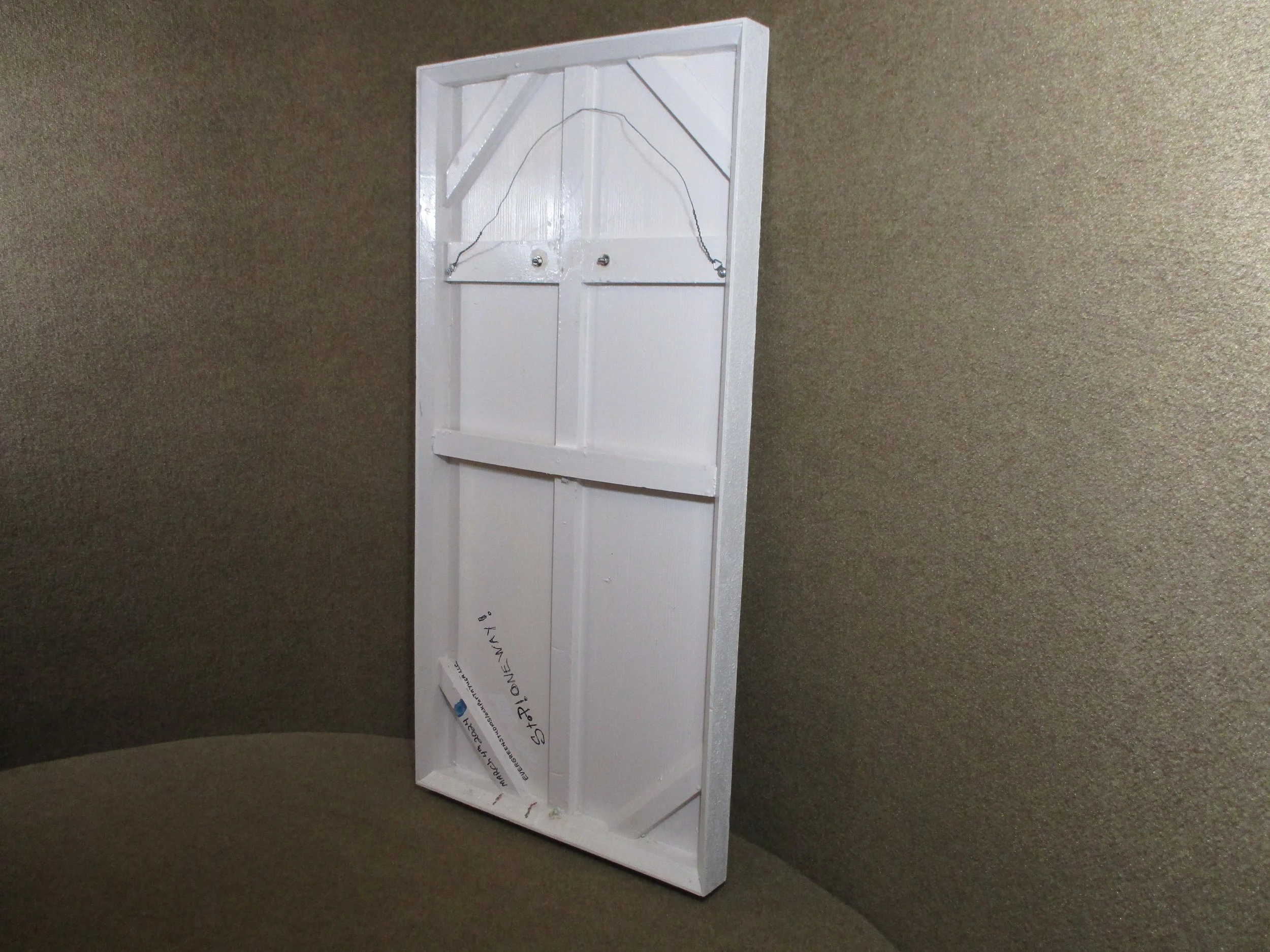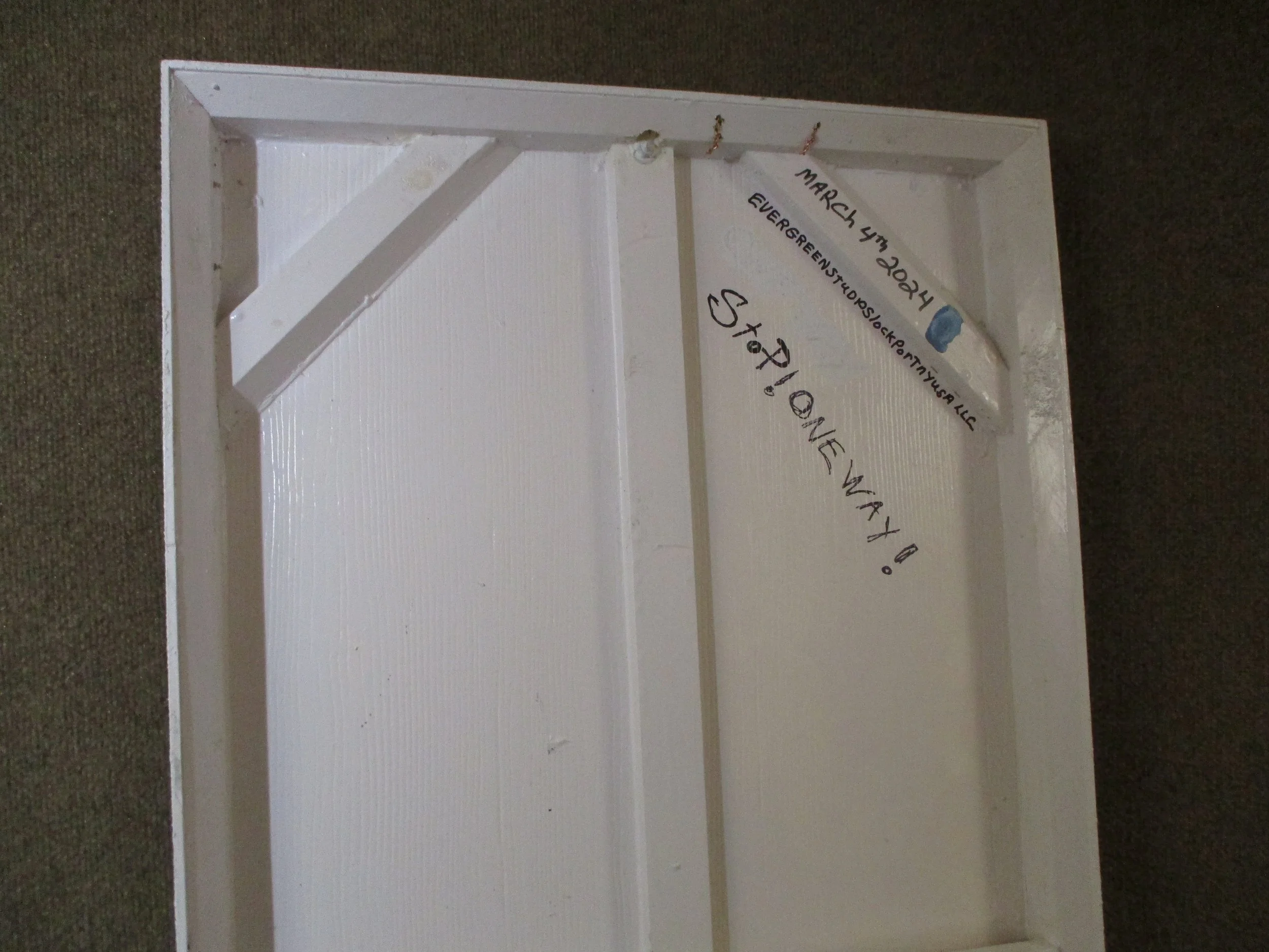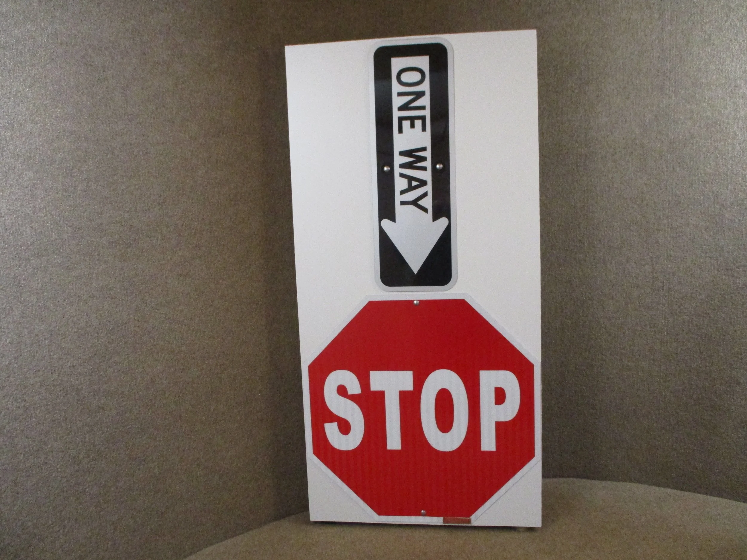 Our lead sculptor Peter Godard takes a new twist with his creation STOP! ONE WAY! The simple bold colors and geometric shapes belies the mysteries of the eturnal. The relief sculptres dimentions are 24x48x2.5 . Fashoned from aluminum road signs and fastened to a handmade wood and polystyrene frame. It is signed with Peter’s hallmark hand crafted copper name plate.